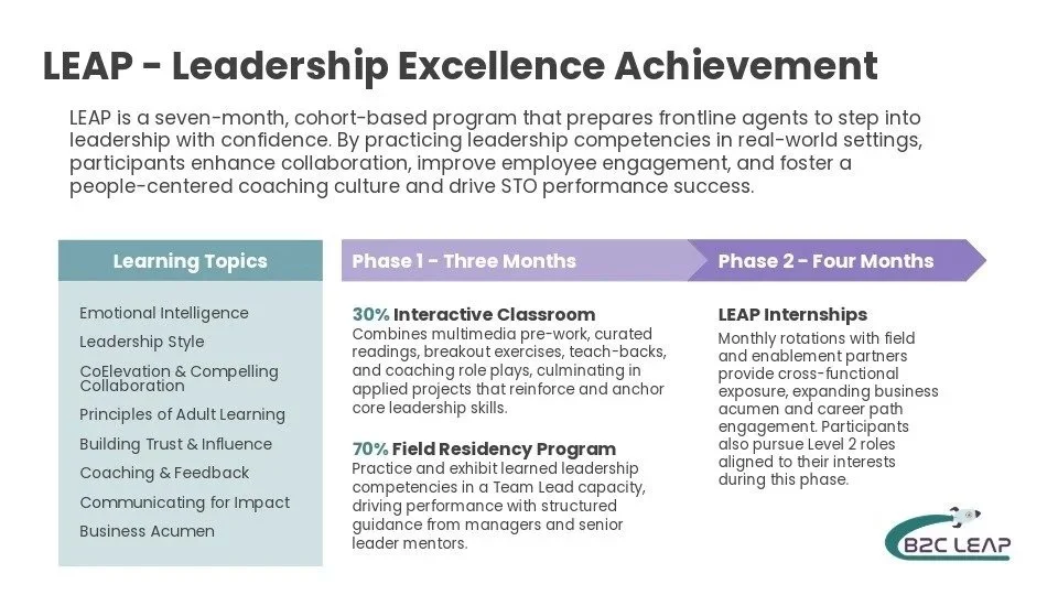 Lack of immersive leadership development opportunities was driving attrition and low engagement scores. I designed a frontline leadership program that integrated virtual classroom learning, on-the-job residencies, and internship rotations to develop future leaders with comprehensive leadership capability and strengthen the leadership pipeline.